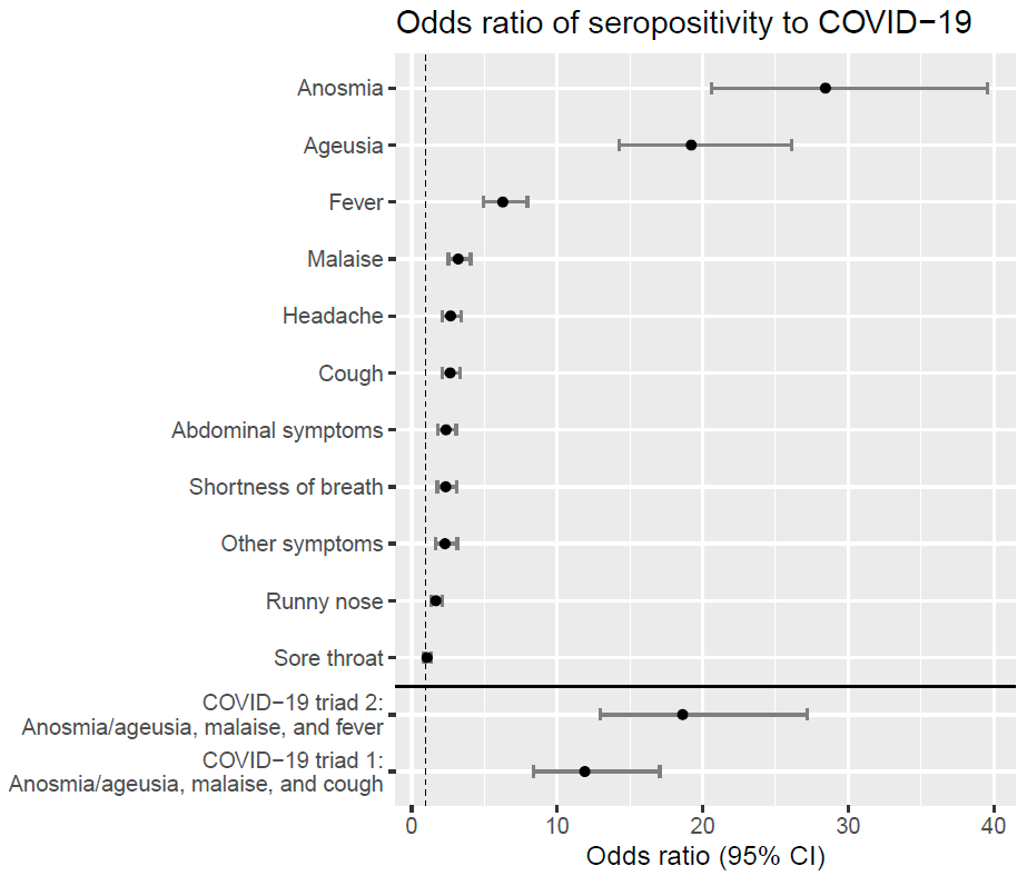 Figur 1. Associationer mellan genomgångna symptom och antikroppssvar. Figuren visar odds ratio (OR) för antikroppssvar vid olika symptom.