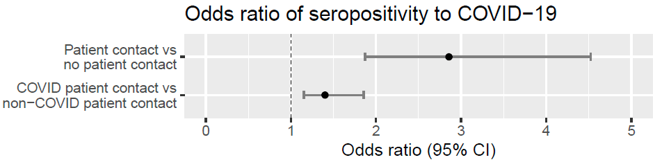 Figur 2. Odds ratio för seropositivitet för medarbetare med patientkontakt jämfört med ingen patientkontakt (överst) samt för medarbetare med covid patientkontakt jämfört med icke-covid patientkontakt.